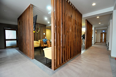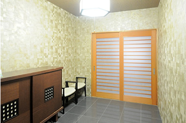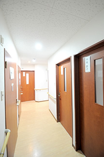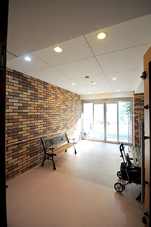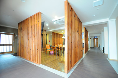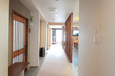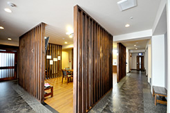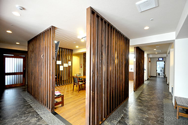 入居者様が「自分の家」として感じて頂けるために、居室の入り口が個別のスペースになるような工夫や、表札、「ガラガラ扉」など、昔ながらの馴染みあるものを取り揃えました。
