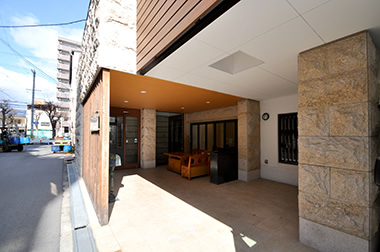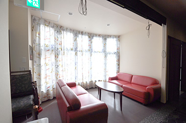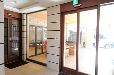明るくフラットな床で、安心のバリアフリー1階玄関ホール。喫茶室が併設されており、外出が難しい入居者様がご家族と一緒に食事をされたり、制限を設けていますがお酒の提供もさせていただいています。