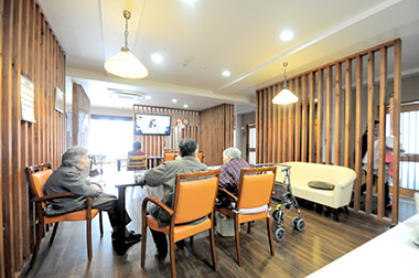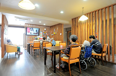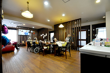ワンフロアー、入居者様6名のアットホームな小規模施設です。 とても大きいとはいえませんが、陽射しが降り注ぎ、明るく暖かいリビングに皆さん集い、 和やかに生活しております。ワンフロア-なので、居室に戻ってそれぞれプライベートな時間を過ごされるのも自由。ゆったりと生活していただいております。