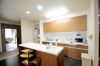 定員が6人と少数で、とても家庭的な雰囲気のグループホームです。リビング兼食堂の傍にはキッチンが備えてあり、料理を手伝っていただく女性、一方で料理ができるまでテレビを見ながら待つ男性の入居者様を見ていると「家」そのものと感じていただけます。